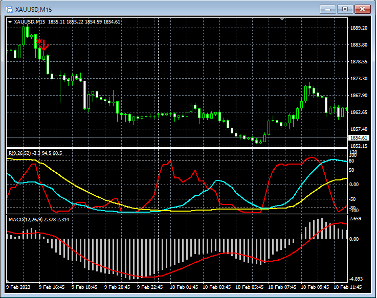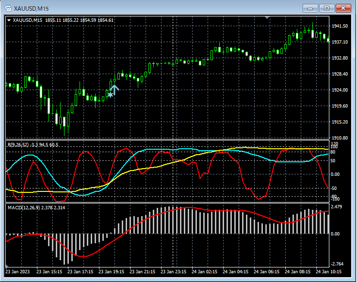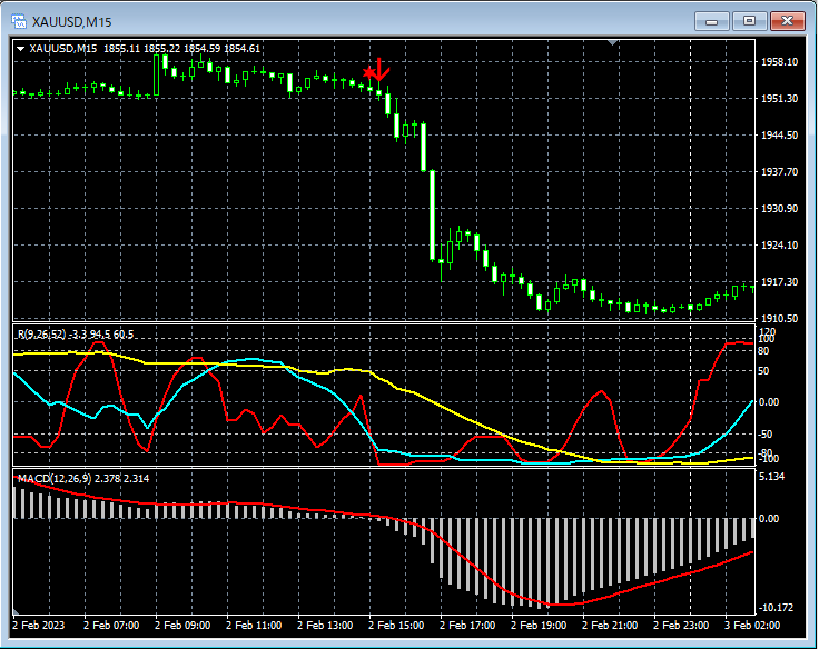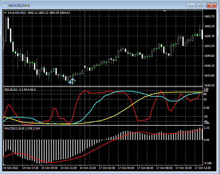RCI3本とMACDのゴールデンクロス,デッドクロスに着目したインジケーター チャート例(18) XAUUSD ゴールド 15分足