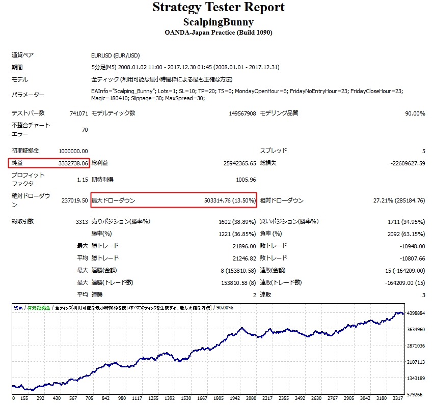 公式バックテストと同じパフォーマンスがほしい場合は、EURUSDスプレッド0.5pips程度の口座を選びましょう!
