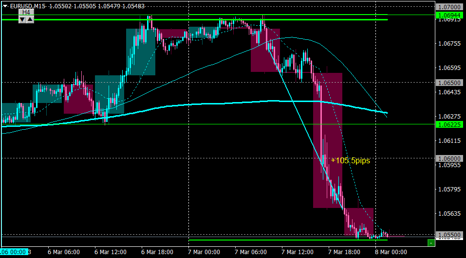 難なく下げたので、24:00の指標発表時もホールドしH4の足のクローズでイグジット。+105pips