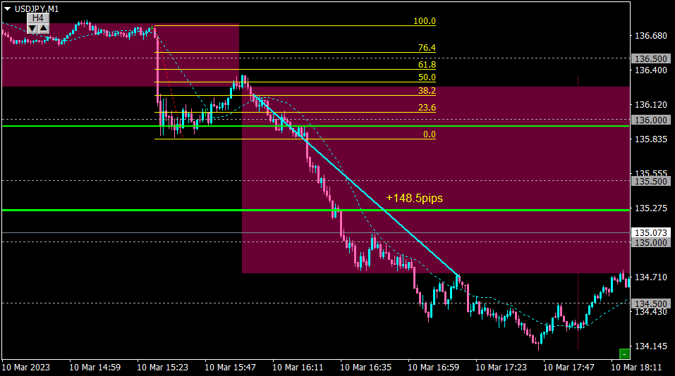 発表後に大きな下落を確認後、動きが速かったので1分足で戻りをショート。+148pips