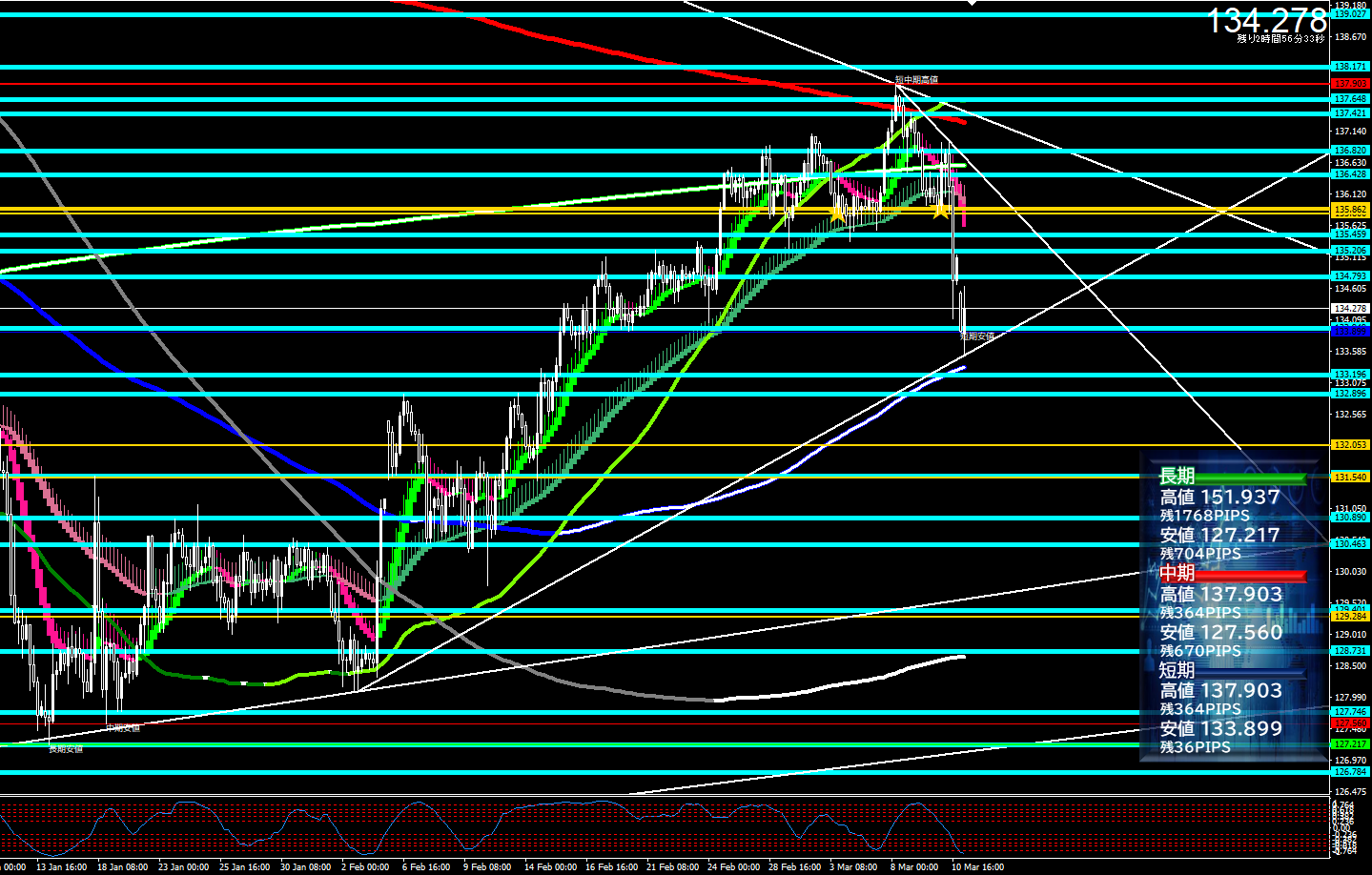 ①135.862円ブレイクは、レジスタンスとサポートの転換ライン。警戒感が緩まりいってこい狙いですが、叩きどころにもなりやすいので要注意。