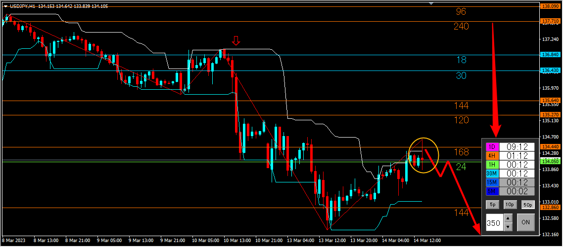 エントリーのトリガーは、1時間足で意識されるグリーンライン(24)を1時間足または15分足で戻しをつけて下降の形となればエントリーです。