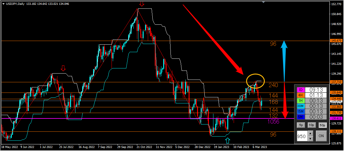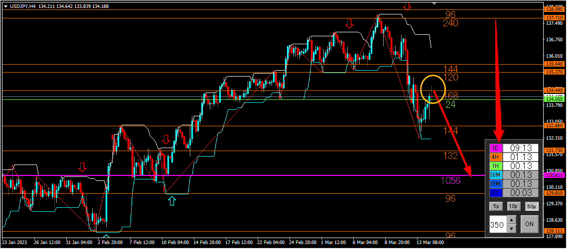 4時間足で意識されるオレンジライン(240)より下降に反転。