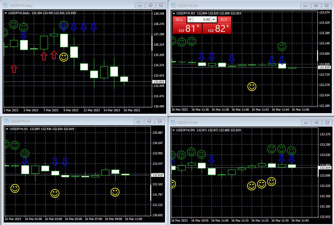 画像の場合は1分足、5分足と緑色ニコちゃんマーク+↓が両方出てます。これは強い下落トレンドと見れるので