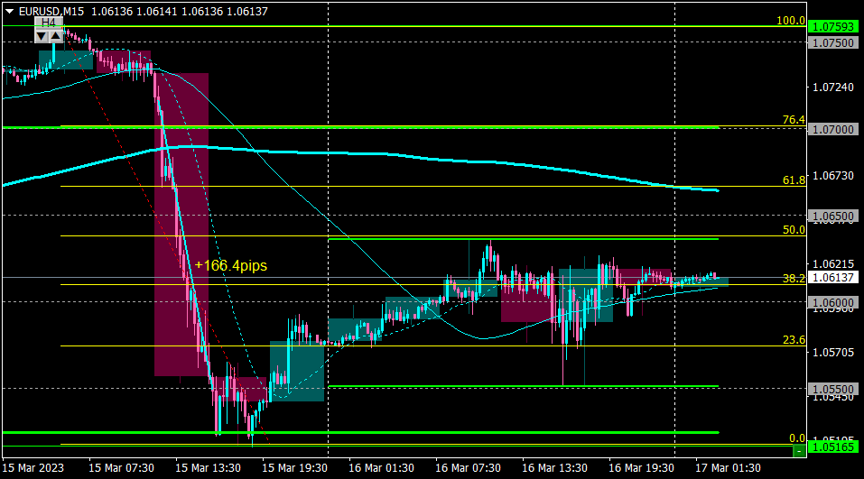 〇前日のトレード・USDJPY ドル円(15分足)昨日は前日安値を割り込んだタイミングでショート。夜までホールドしM15レベルのダウが変わったタイミングでイグジット。+61pips・EURUSD ユー