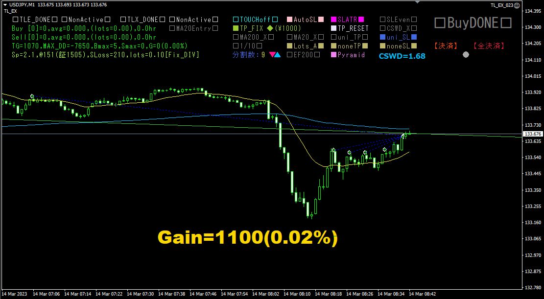 もともと「Trend Line EX」は、日足などの長い時間足で、大きめの利幅を狙うつもりで開発した半自動EAですが、分割エントリーを使用することで、1分足などの短い時間足でも、十分対応できることが示されたと思います。