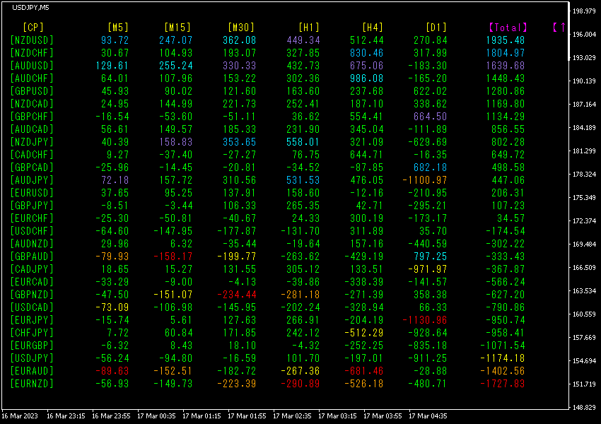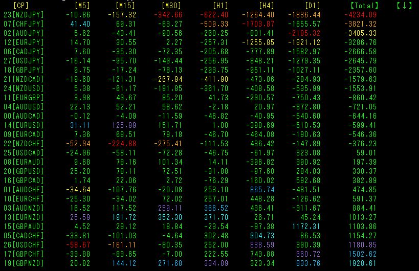 [Total]で降順に並び替えています。数値的には、トレンドとして強くないですが、一番上の行のNZDUSDの[M5]~[H1]が青色系の表示になっているので、短い時間足で上昇トレンドになっていることを示しています。28通貨ペアの中で、トレードするのであれば、「NZDUSDの買い」になります。
