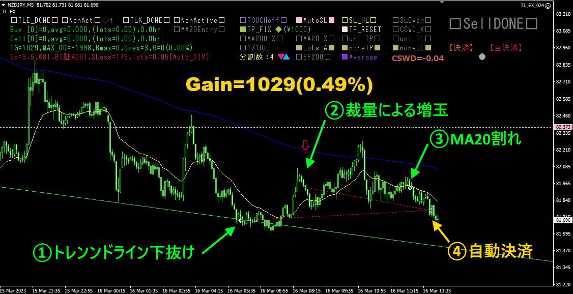 最初にトレンドライン下抜けで自動エントリーしました。①
