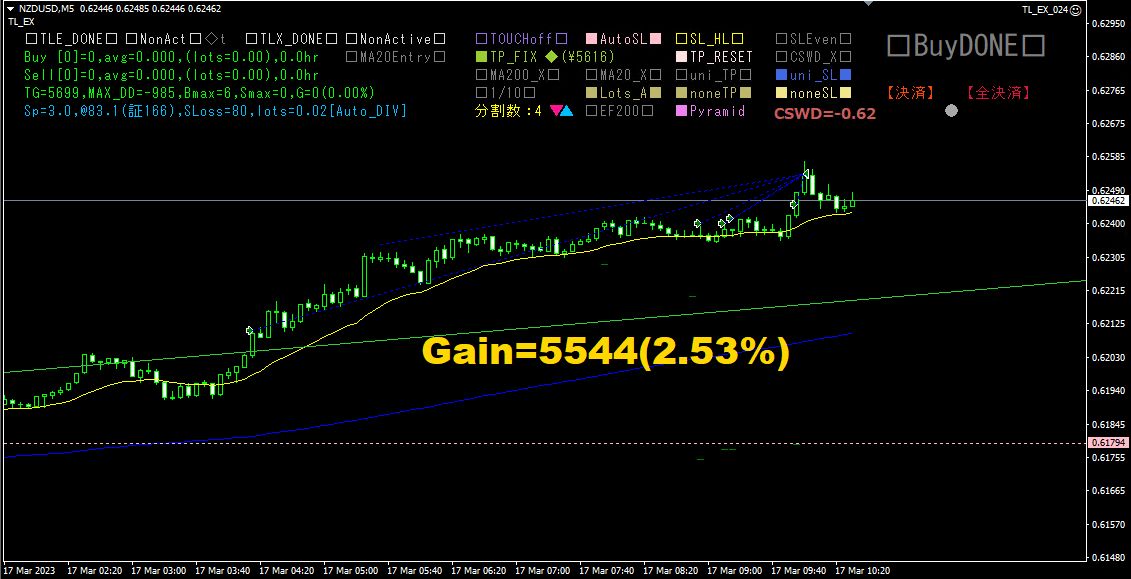 上の図は、実際のトレード結果です。トレンドライン越えエントリーに加え、裁量で増し玉し、MA20越えエントリーにより、Pyramidモードで自動買い増しを行いました。チャートは上昇トレンドの途中にあり、MA20がMA200より上に位置していて、移動平均線の傾きが右肩上がりなので、自動で次々と増し玉されました。得られた利益は\5,544です。