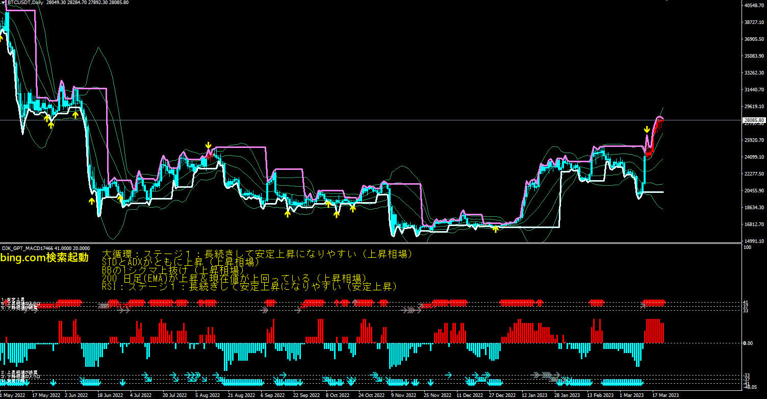 BBの1シグマ上抜け、200日足(EMA)が上昇しており、現在値が上回っていることを確認しました。