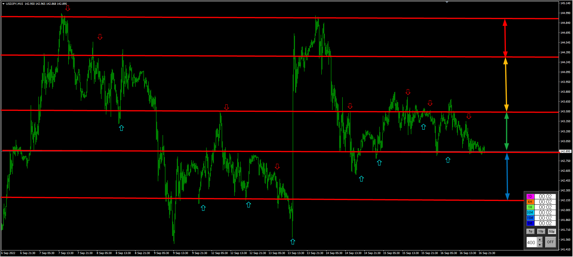 このラインを1時間足か15分足でブレイクするのがエントリーのトリガーとしてよさそうです。