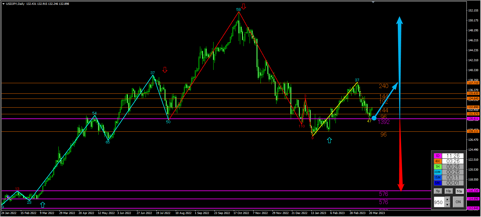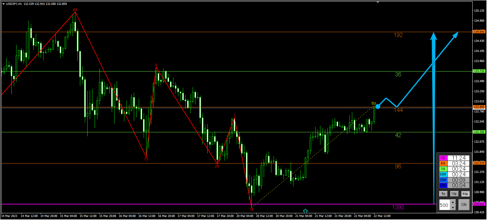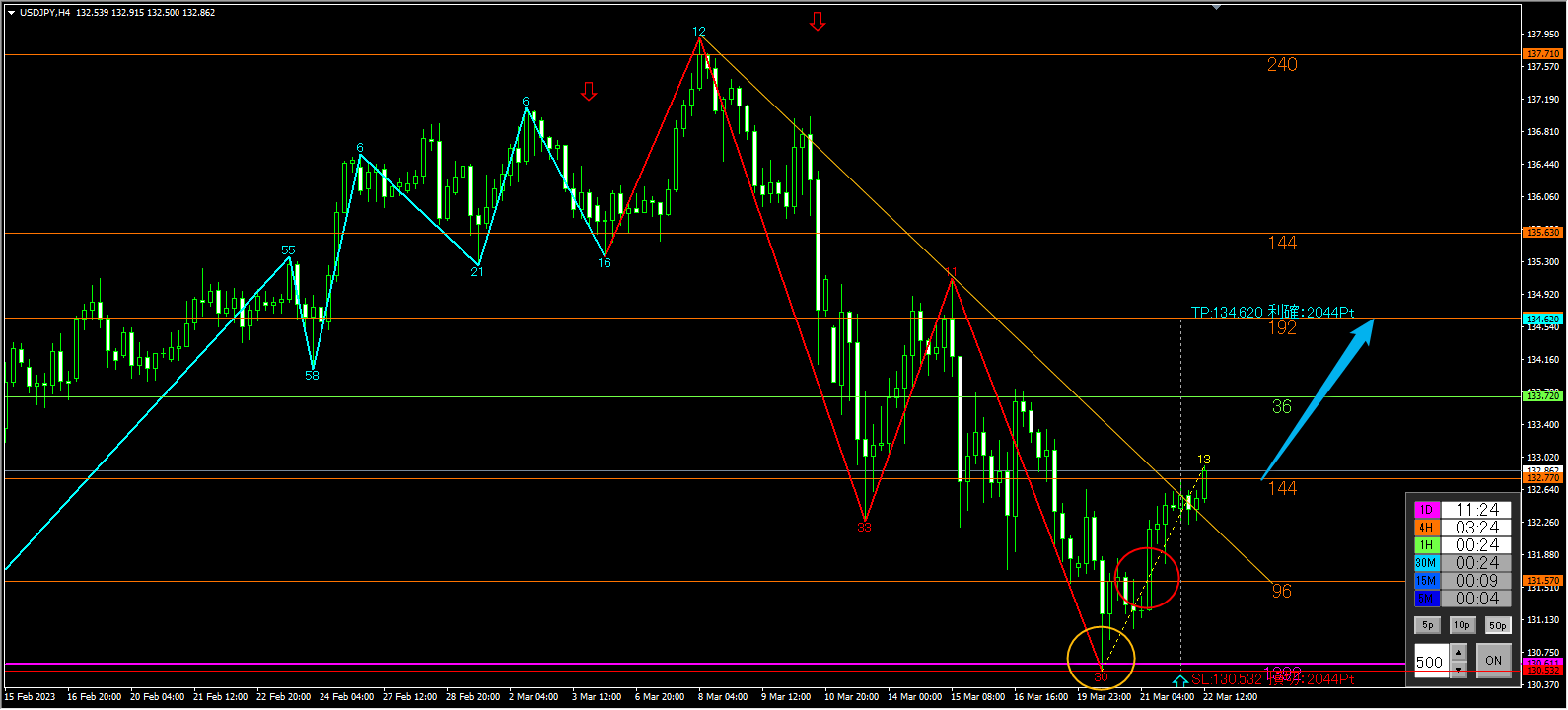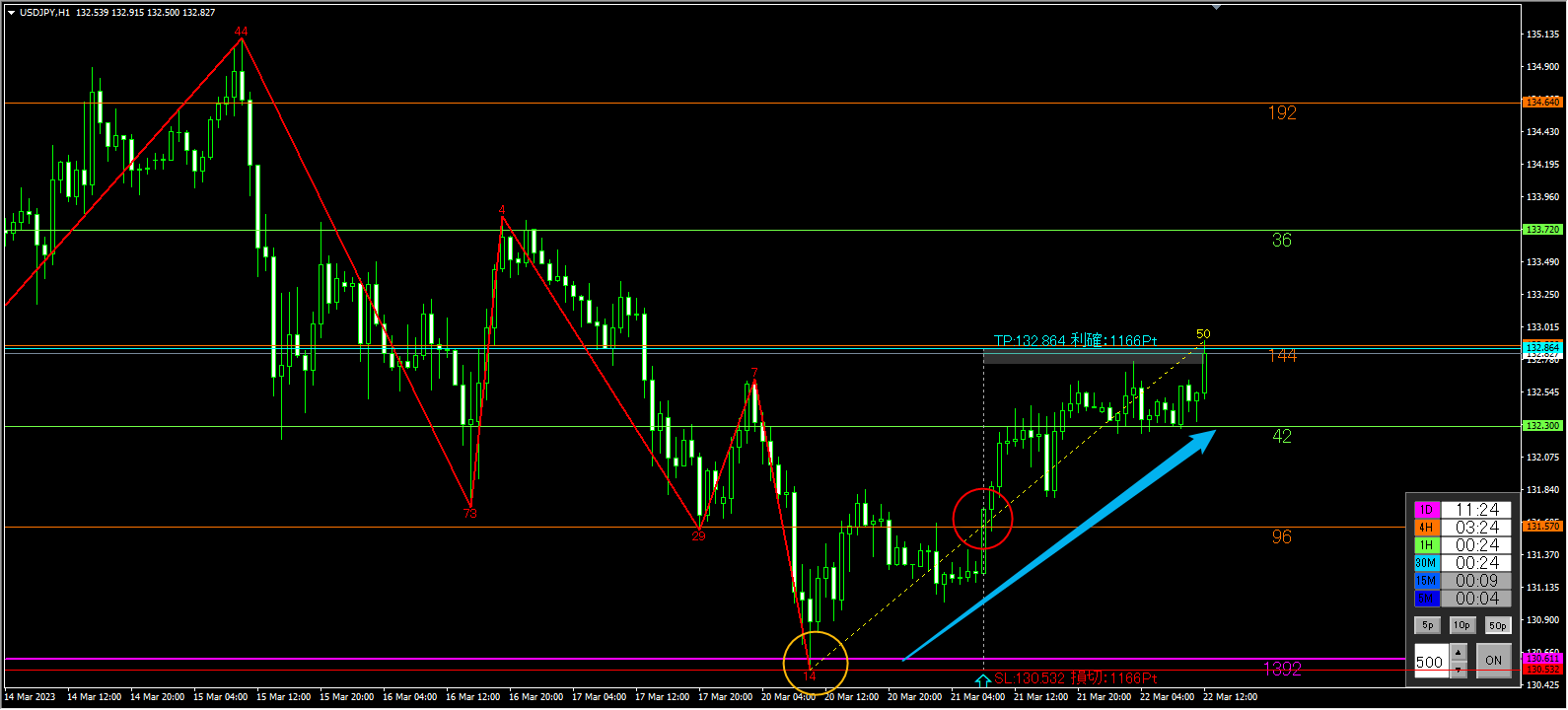 下降のトレンドライン(黄色)も明確に抜け、黄丸付近の日足で意識される紫ライン(1392)にSL、オレンジライン(96)をブレイクアウトしてのサインです。