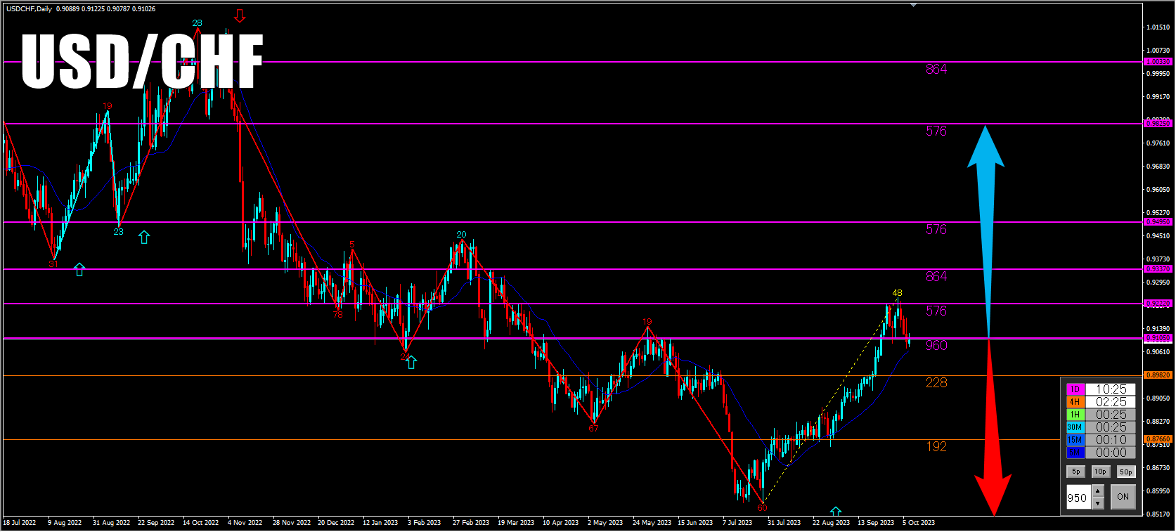 こちらも4時間足チャート同様にSLポイントを紫の日足ライン、オレンジライン(96)をブレイクアウトしてからのサインで、優位性の高いサインだったためエントリーして116PIPS近くゲットできました。