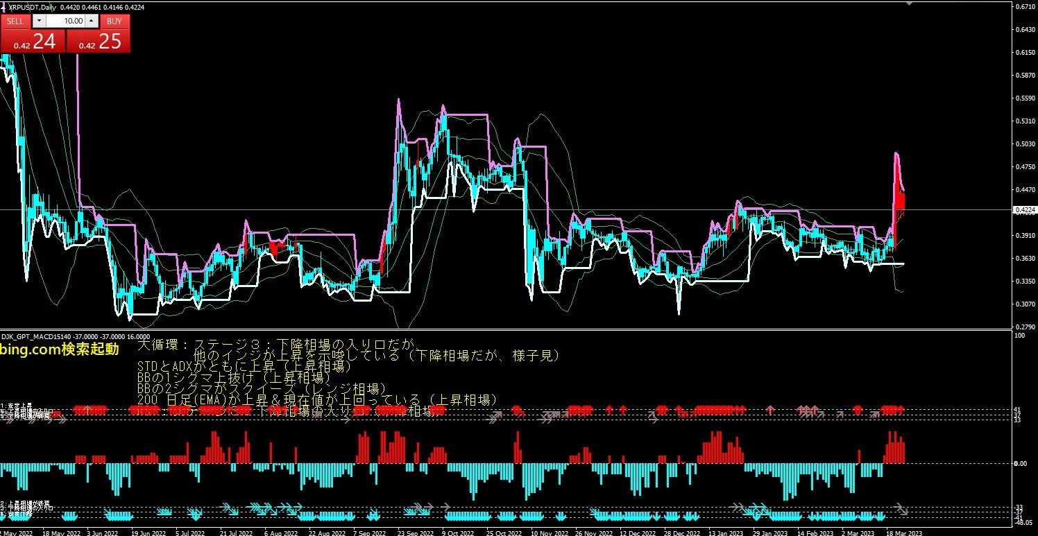 売り標準偏差レンジとADXがともに上昇(下降相場)。BBの1シグマ下抜け。BBの2シグマがスクイーズ。200 1時間足(EMA)が上昇&現在値が上回っている。RSI:ステージ4:長続きして安定下降にな