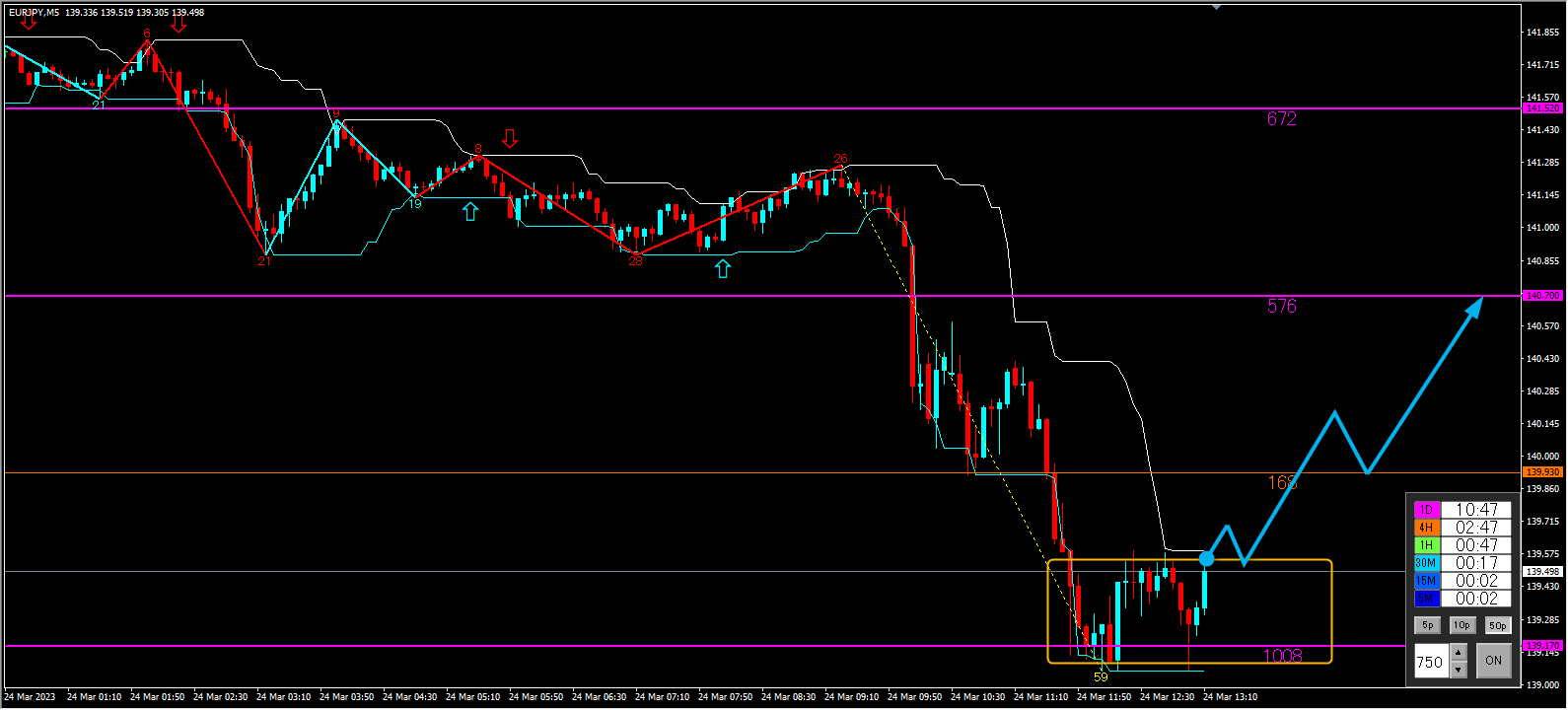 大きな下落の返しとしてフィボナッチとリースメント38.2を目標とすると、TP目標は紫ライン(576)付近。