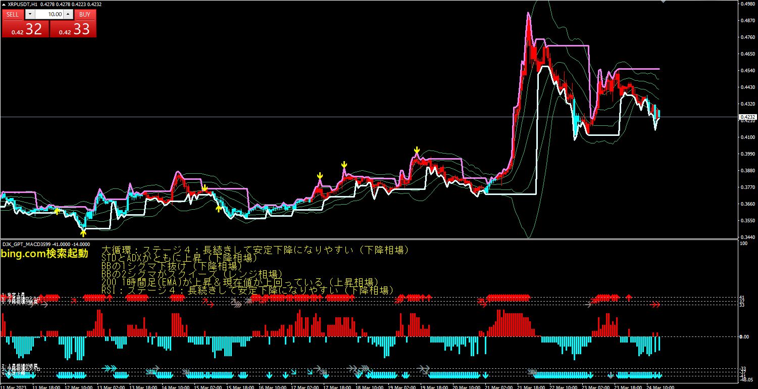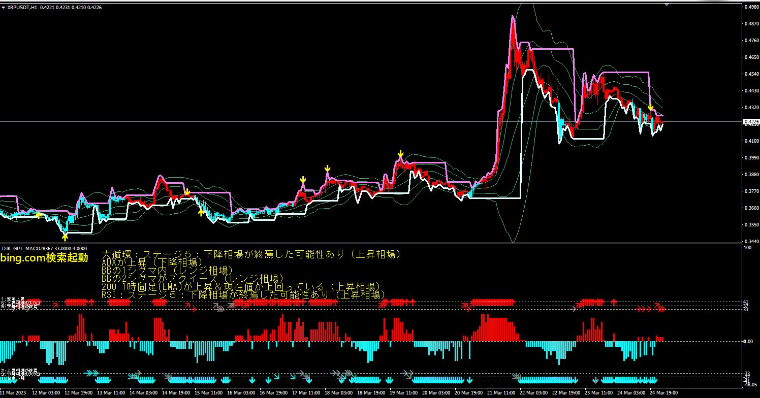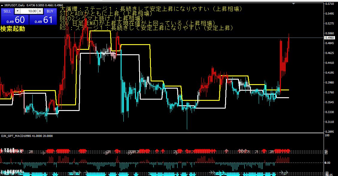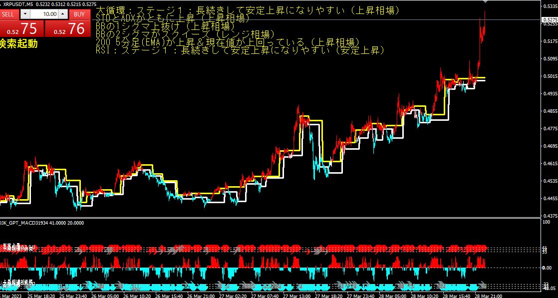以上の条件から判断すると、XRPUSDTは現在強気相場にあり、買いポジションを持つのが適切かもしれません。ただし、相場は常に変動するものなので、自己責任で判断してください。