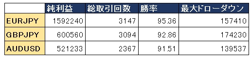 今回の「Multi Logic Shot_EA T2」はEURJPY、GBPJPY、AUDUSDとクロス円の人気通貨とAUDが参加です。