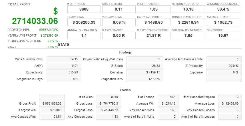初期ロット0.1設定での最大ドローダウンは15.7万円、10年バックテストでの利益額は159万円になりました。