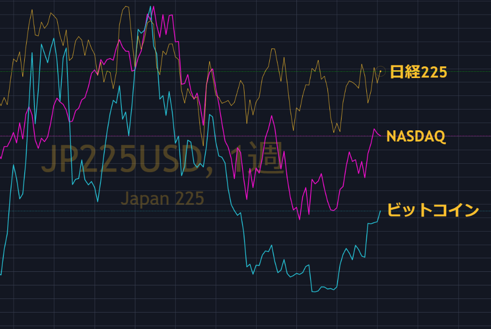 その前にビットコインと日経225・NASDAQの相関を見てみましょう。