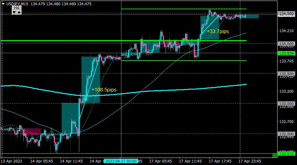 H4の足の完成でイグジット。+33pips