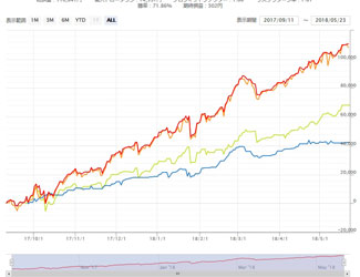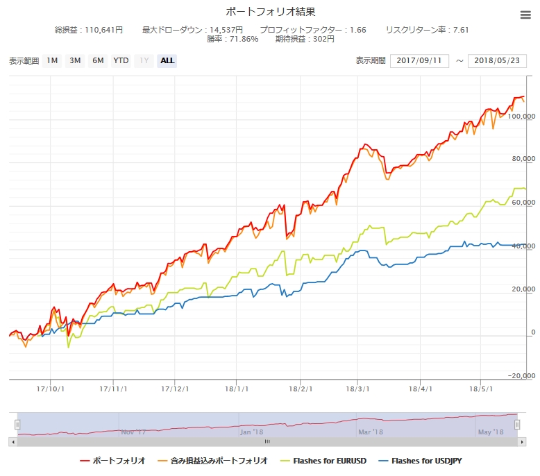 フォワードは1.0Lotで運用していますが、Flashes for USDJPY、EURUSDともに0.1ロットで同時運用した場合の