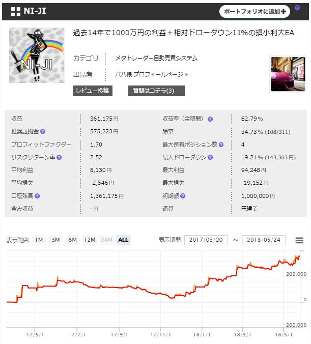 計測期間1年ちょっとで最大ドローダウン14万円に対して収益が+36万円となっており、
