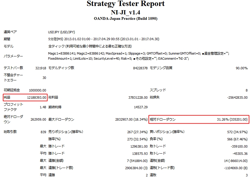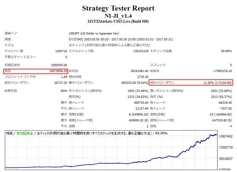 14年間のバックテストでは相対ドローダウン11%で1047万円の利益になっています。