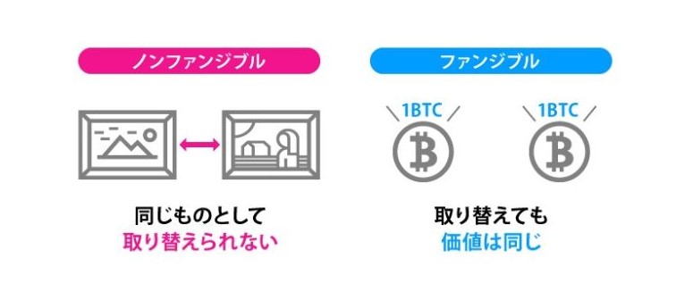 ファンジブルトークンは1BTCならどれと交換しても同じという意味になるがノンファンジブルトークンは取り替えができないオリジナルのデジタル資産という意味になる。