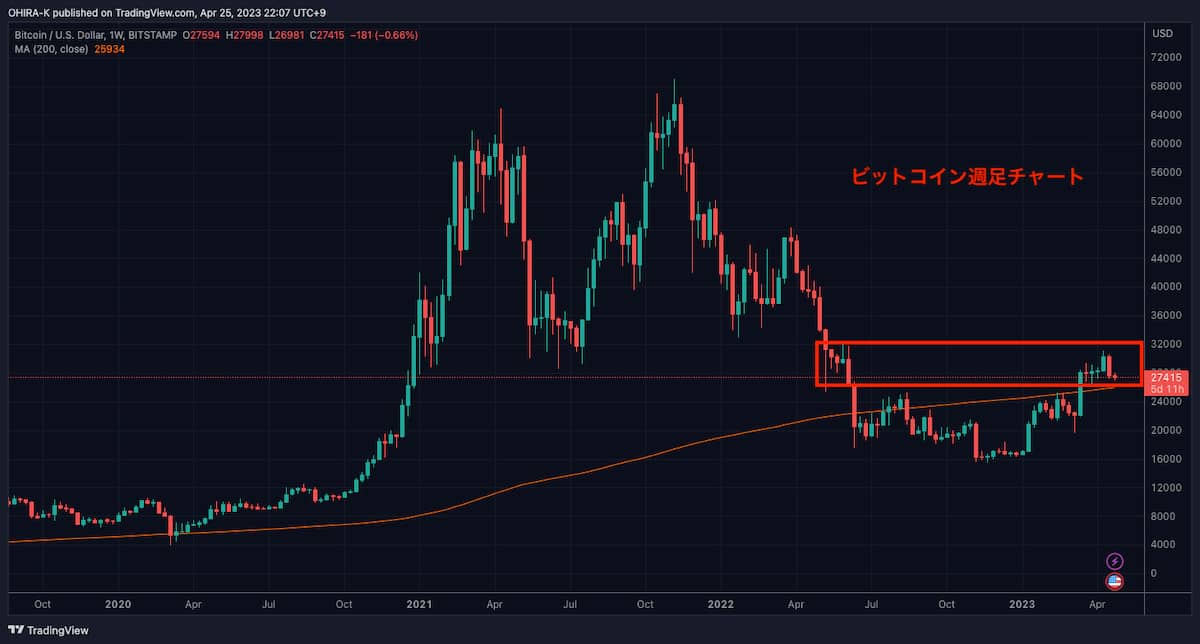 今の価格を週足チャートみると、2021年の5月に大きく下落した水準、2022年の7月の下落前の価格水準となっています。