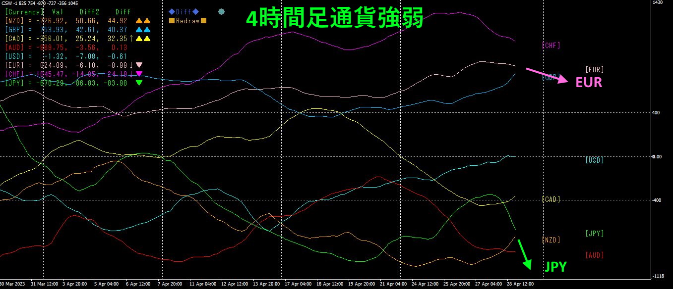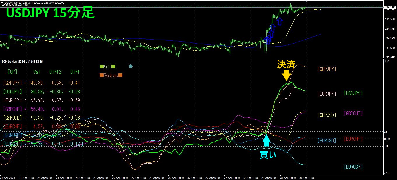 4月28日(金曜日)の日銀金融政策決定会合結果発表の影響で、USDJPYは大きく円安に振れてきました。「見える化インジケータ」で、USDJPYのグラフが、他の通貨ペアを抜いて上に伸びてきたところで買いエントリーします。金曜日の夜に利確すれば、約230pipsの利益になりました。