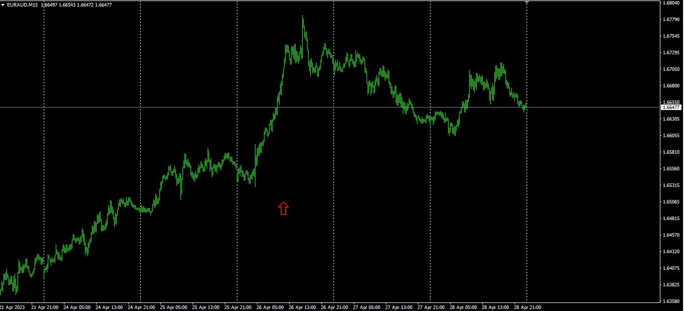 赤色の矢印がスクリーンショットを撮影した所です。上昇トレンド部分を的確に捉えてはいます。「28通貨ペアBest Selectインジケータ」は、全28通貨ペアの中で、最もトレンドが発生している通貨がどれであるかを正しく教えてくれます。トレンドフォローで、買いポジションを建てれば、利益になります。