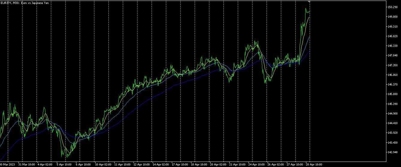 EURもJPYも上向きになっています。比べるとJPYの角度がEURの角度より急になっているので、今後この傾向が続くのであれば、EURJPYは下げ方向に向かうと予想されます。