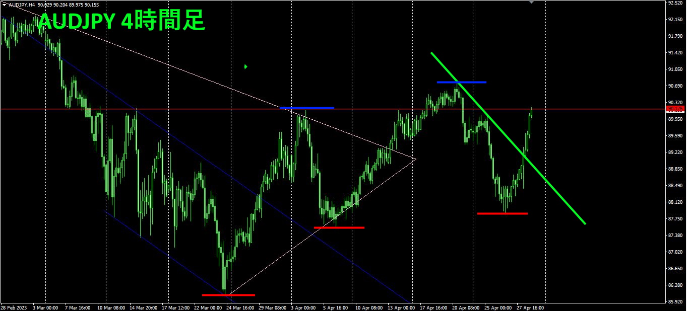 赤色水平線がレジスタンスラインになっていて、一旦は戻されました。しかしながら、既に下降トレンドは終了していて、安値切り上がり、高値切り上がりの上昇トレンドに移行しています。このような状況であれば、緑色斜めライン上抜けで買いエントリ―しても良かったです。レジスタンスラインで再度戻されるかもしれませんが、方向性は上ですので、「押し目買い」でトレードして行きましょう。
