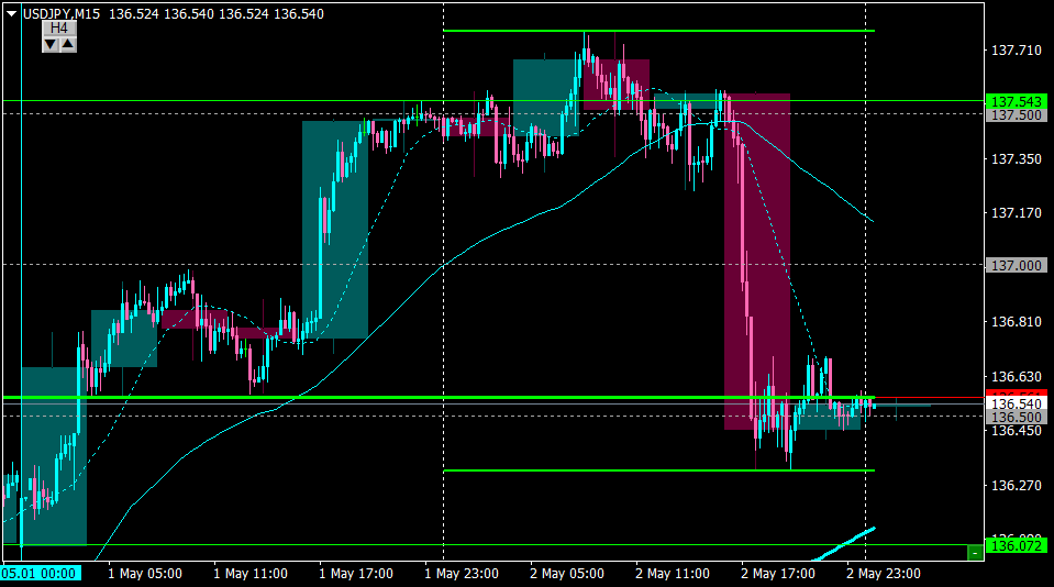 〇前日のトレード・USDJPY ドル円(15分足)先週の金曜は、強いと思われたサポート150.50を割り込んできたので、シナリオ変更しショート。ロング勢の損切りも巻き込んで大きく下げた。+71pips