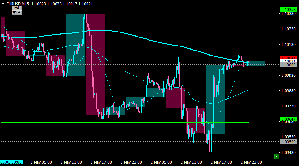 〇前日のトレード・USDJPY ドル円(15分足)先週の金曜は底値圏での動き。エントリーするタイミングがなくノートレード。・EURUSD ユーロドル(15分足)先週の金曜は、1.10での天井圏からの下
