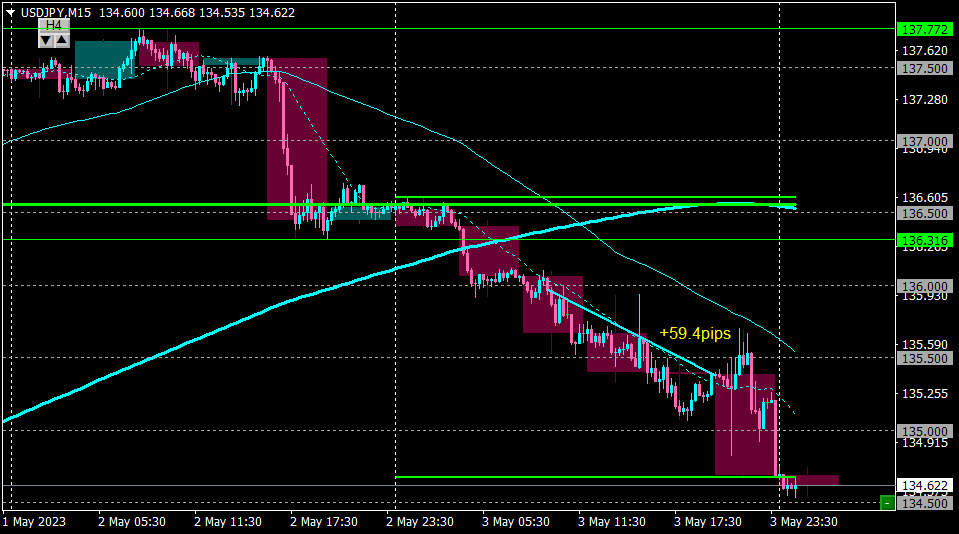 深夜のFOMC発表の前、H4の足の完成後にイグジット。+59pips
