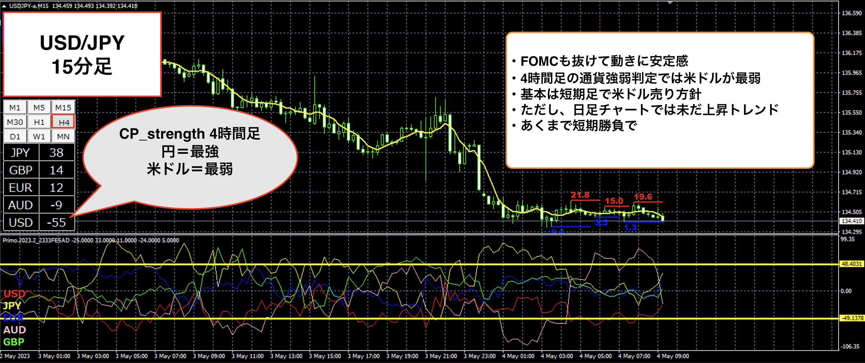 4時間足で米ドルが最弱、円が最強となっています。