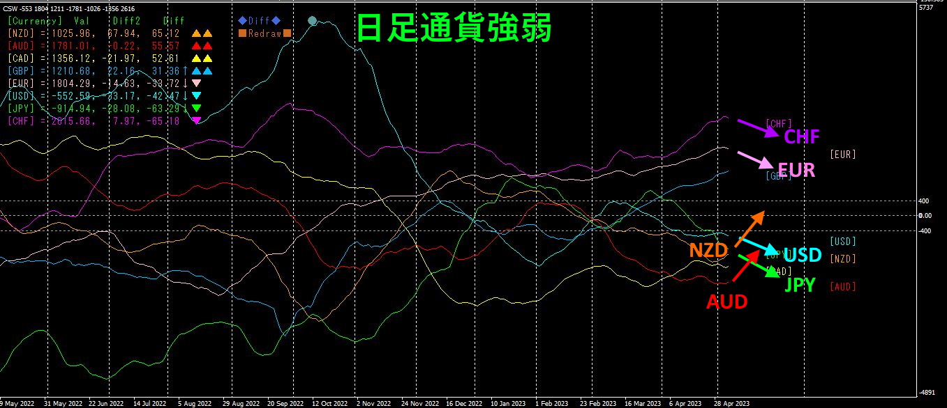 時間足の通貨強弱グラフを順に見ていくことにします。