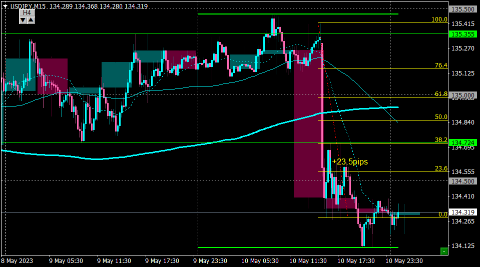 発表後に下落し前日安値を割ってきたので、いったんその水準まで戻るまで待って上げ止まりを確認してからショート。