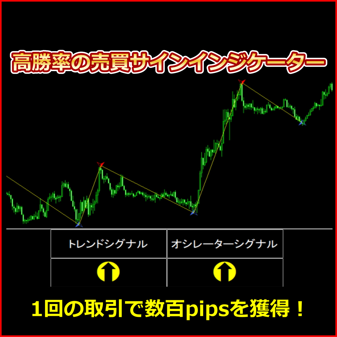 メインウィンドウに、買いと売りの売買サインが表示されます。売買サインがはっきりとわかります。 サブウィンドウには、独自の秘伝の○○ロジックを搭載したトレンドシグナルとオシレーターシグナルがあります。 トレンドシグナルとオシレーターシグナルの2つが上矢印の場合、大きく上昇します。また、トレンドシグナルとオシレーターシグナルの2つが下矢印の場合、大きく下降します。 1回のトレードで、例えば、ユーロ円でしたら、200pipsから500pipsぐらい取れますので、月収100万円も十分に狙えるでしょう。 10万通貨での取引の場合、1回のトレードで200pips(20万円)から500pips(50万円)の利益を狙えます。 私はこのサインツールのおかげで、月100万円以上の利益が出せるようになりました。