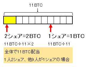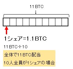 1シェアの9人は11BTCを11で割って、1BTCの配当になります。