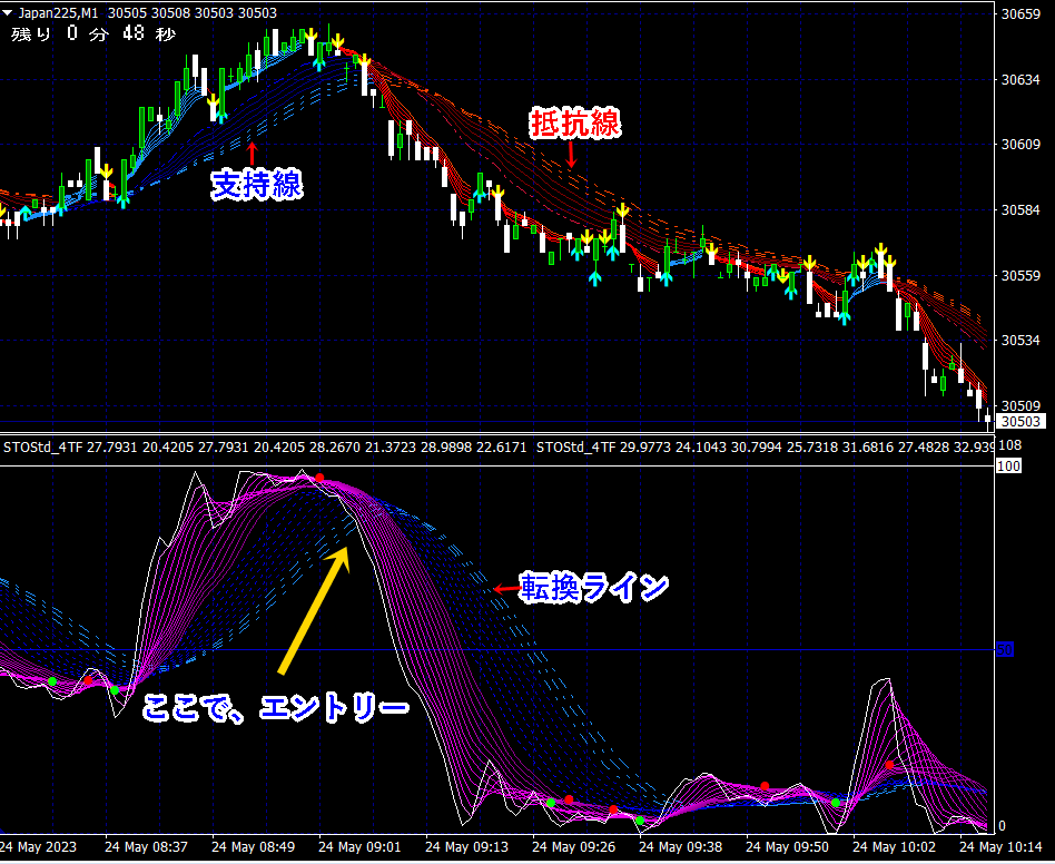 天底チャート(令和版)では、移動平均線だけでなく、インジケーターの曲線帯にも支持線・抵抗線=転換ラインとして機能するラインを分かりやすく表示しています。