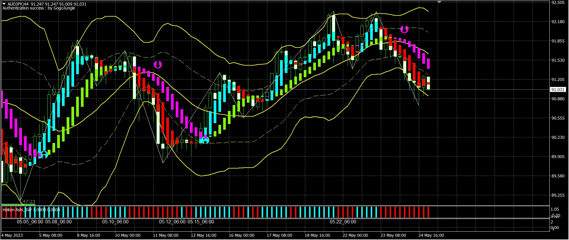 ドル円は買いポジションがリミット141.00を達成し+95pipsとなっております。豪ドル円は買いポジションを昨日4時間足18時の終値95.75で決済し+40pipsとなっております。