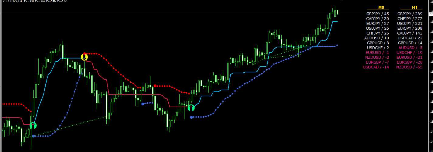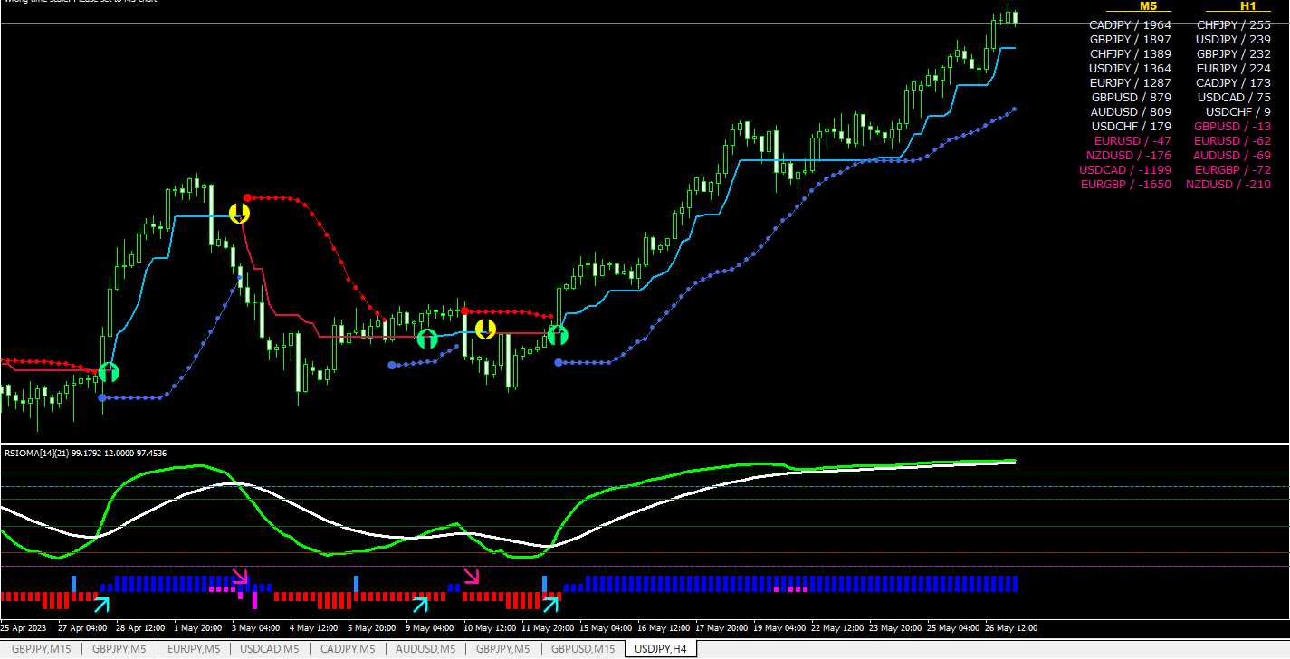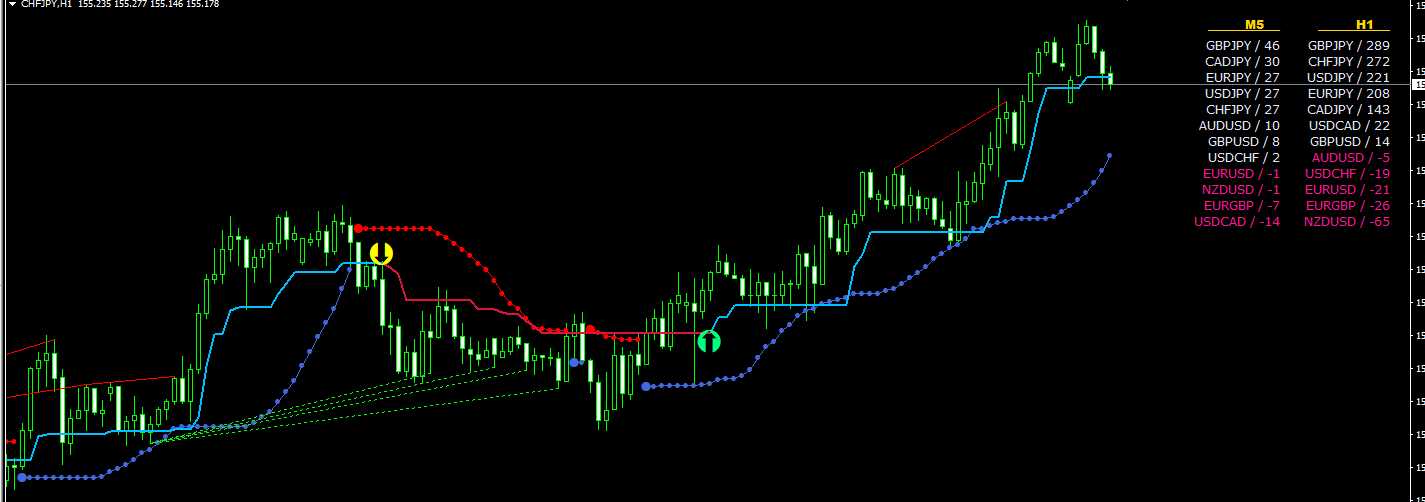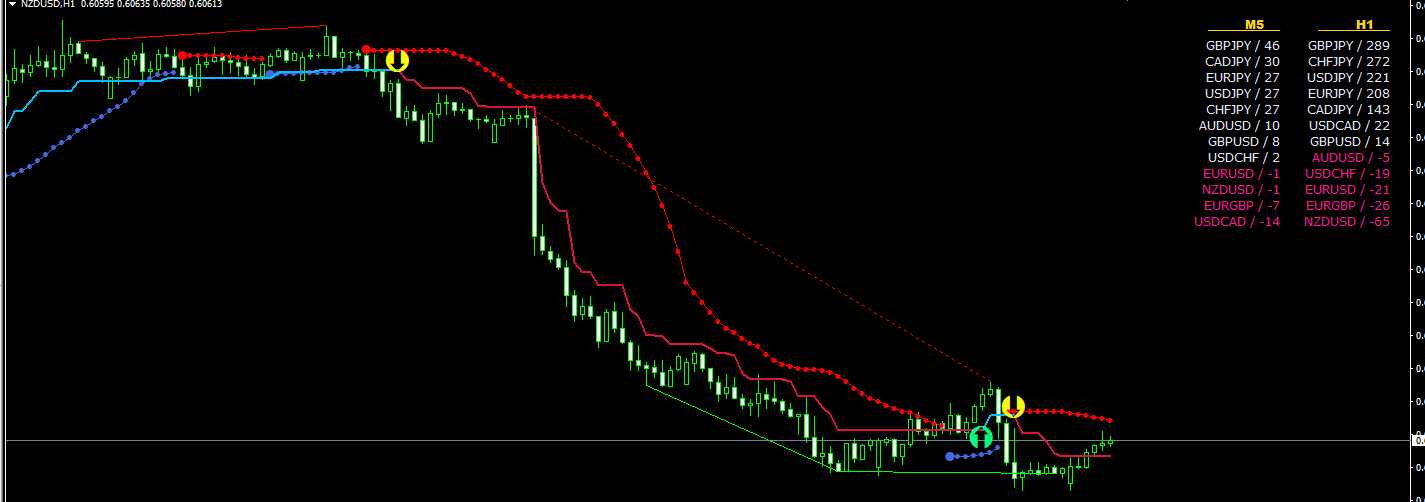 ② 滑らかなローソク足の上と下にトレンド継続ドットシグナル追加。