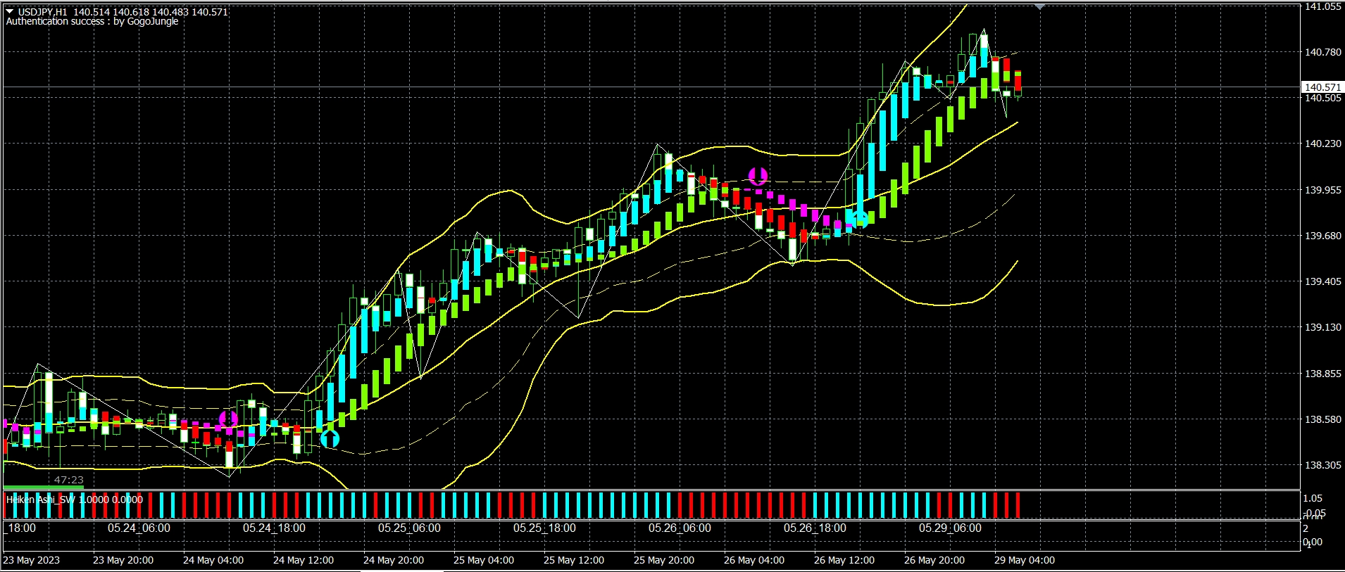 ドル円は買いポジションがリミット141.00を達成し+95pipsとなっております。豪ドル円は買いポジションを昨日4時間足18時の終値95.75で決済し+40pipsとなっております。