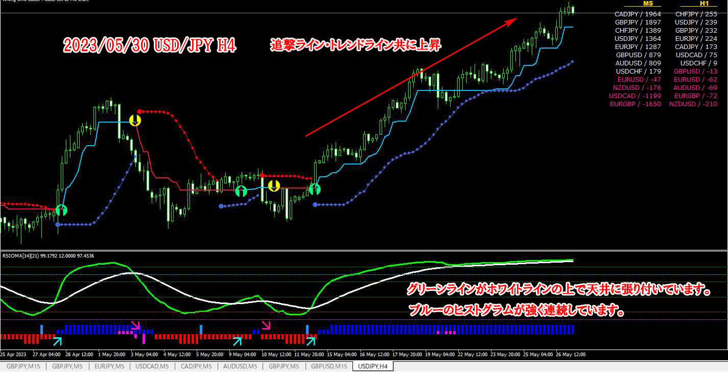 追撃シグナル( ドットの連続 )、フォローラインもブルーのまま上昇。