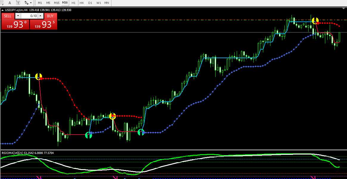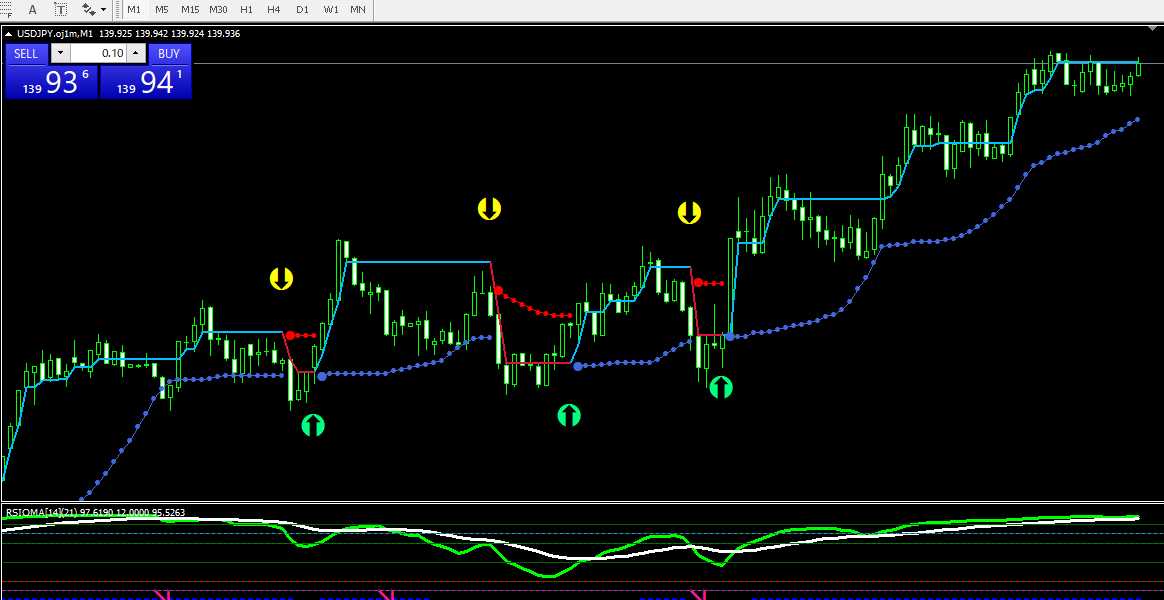 こちらもメインシグナルと同時に出ていますが、ローソク足の上と下にそれぞれ青と赤のドットの連続シグナルが出ていますので、どの程度の勢いかがドットの連続のカーブの度合いで判断できます。