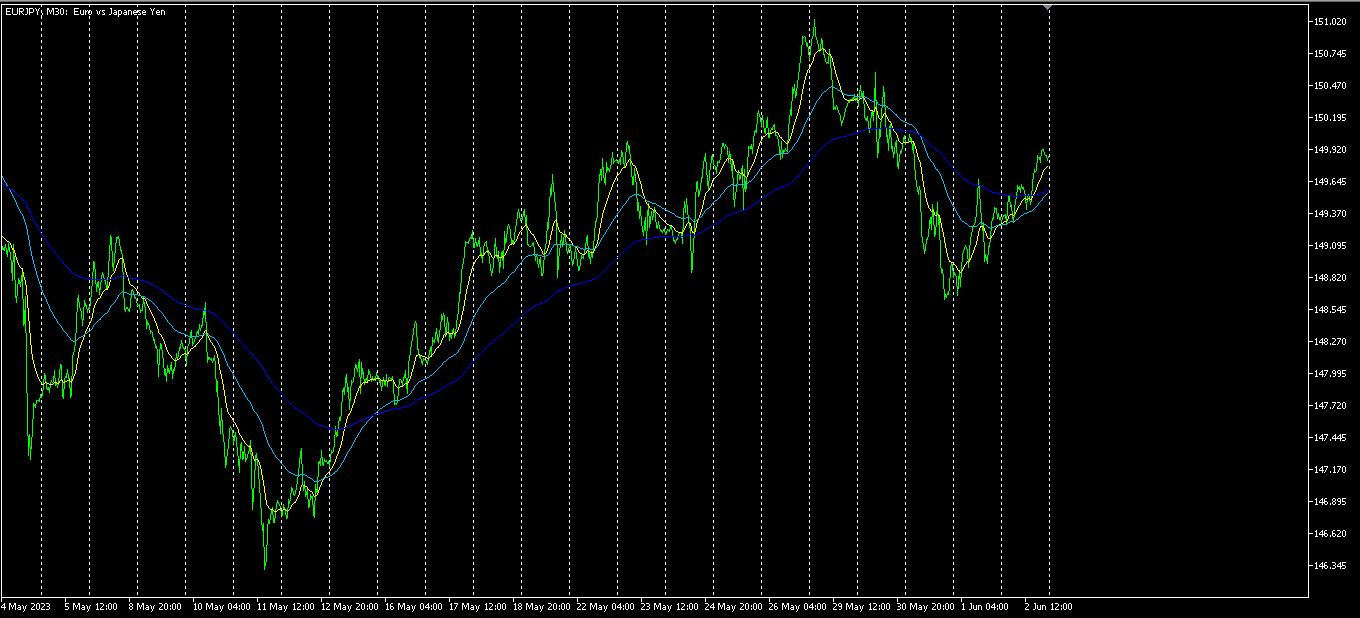 ピンク色がEUR、緑色がJPYです。EURもJPYも下向きです。角度としては、JPYの方が、EURよりも急角度になっています。従って、しばらくはEURJPYの上昇傾向が続くと考えられます。
