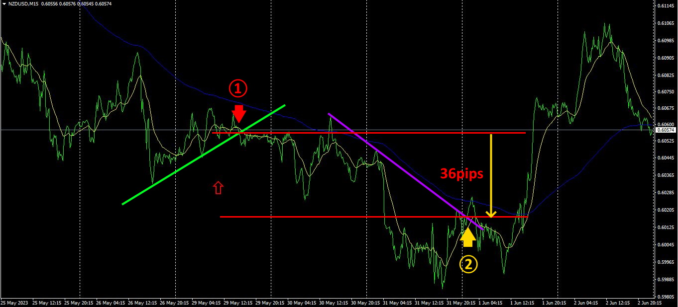 ①3角持ち合い部分に、カウンタートレンドライン(緑色)を引いて、これを下抜けしたらエントリーします。