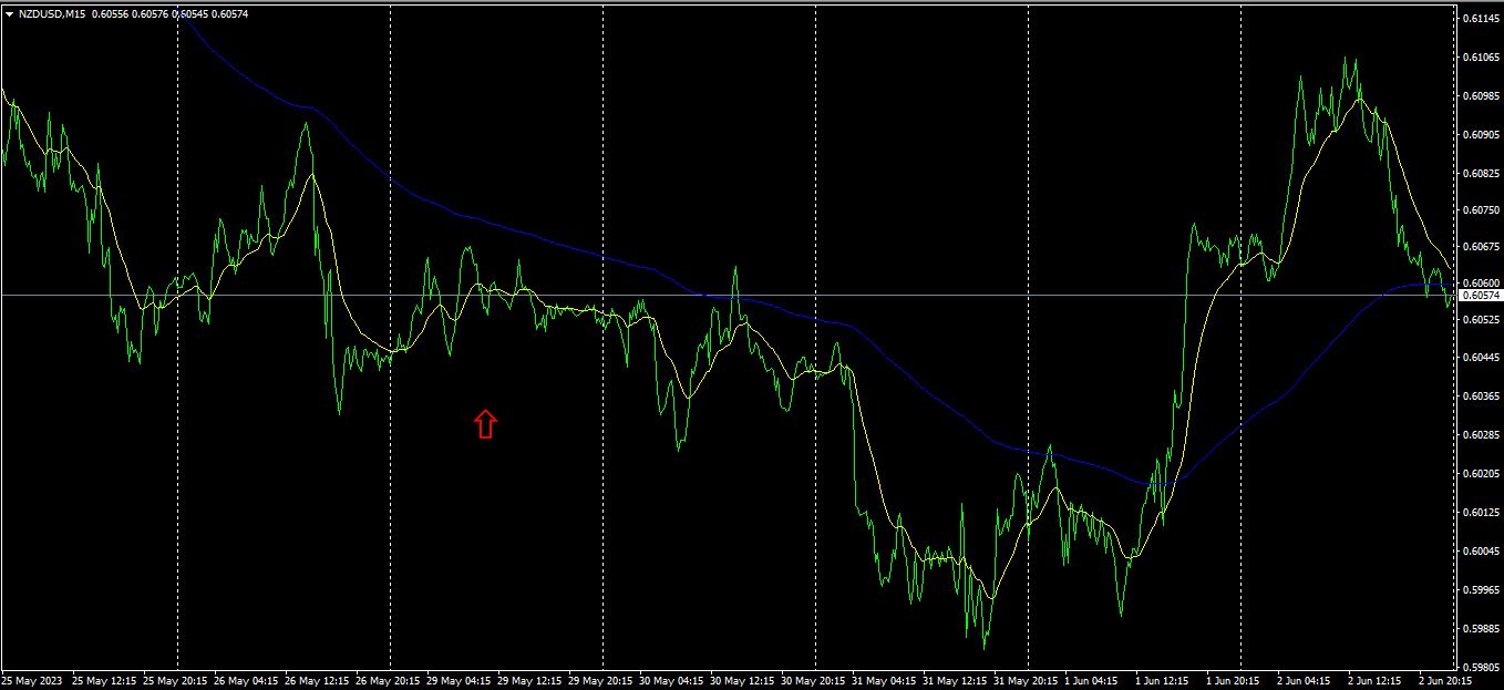 NZDUSDの数値データとカラー表示を詳細に検討してみると、日足、4時間足が下降(赤系の表示色)、1時間足と30分足が上昇(青系の表示色)、15分足、5分足は、トレンド無し(緑色表示)という情報も読み取れます。チャートの移動平均線(EMA200)が下降していることからも、長期足では下降トレンドであることが分かります。従って、もしトレードするのであれば、次のようなトレードになるでしょう。